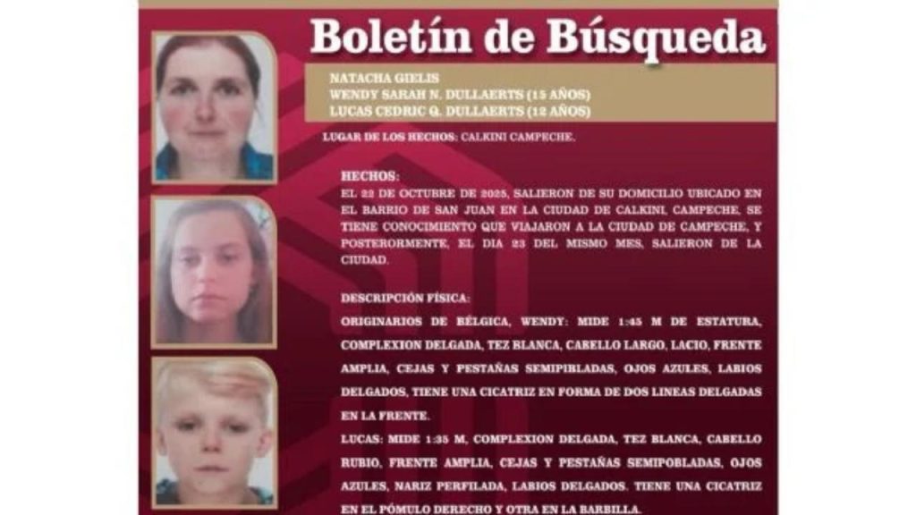 SAN FRANCISCO, Cam. (apro).- Una familia originaria de Bélgica desapareció en el estado de Campeche el 23 de octubre. La Comisión Local Búsqueda de Personas detalló en una ficha de búsqueda que se trata de Natacha Gielis y sus hijos adolescentes, Wendy Sarah Dullaerts de 15 años de edad y Lucas Cedric Dullaerts de 12 años de edad.