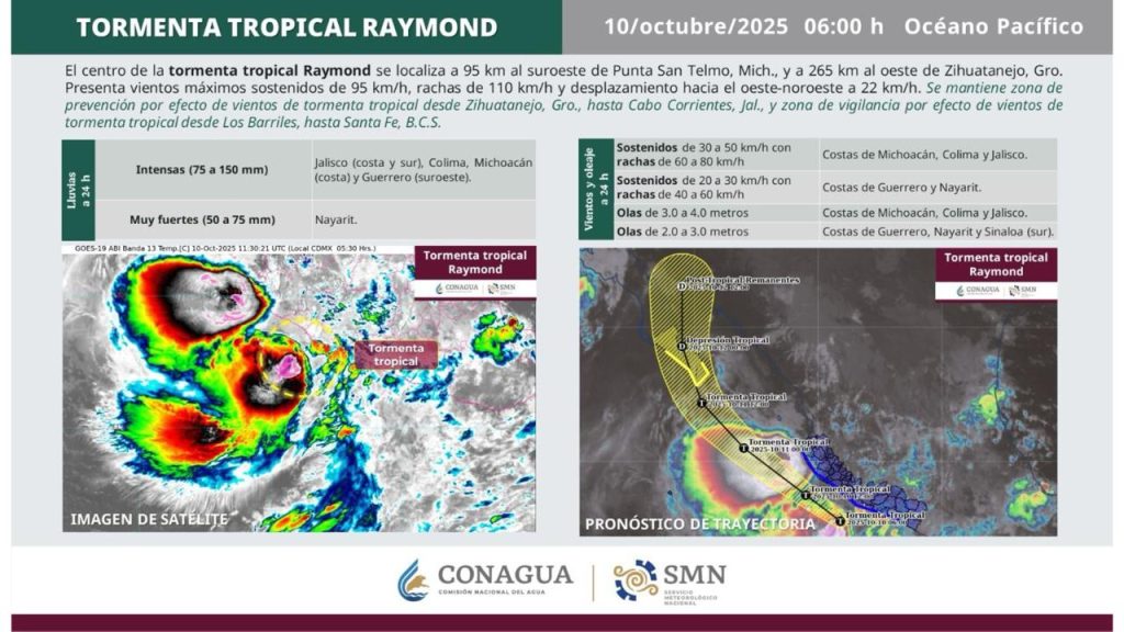 El Servicio Meteorológico Nacional (SMN) informó que la tormenta tropical Raymond continúa desplazándose de forma paralela a las costas de Michoacán, provocando lluvias intensas, fuertes rachas de viento y oleaje elevado en el sur y occidente del país.