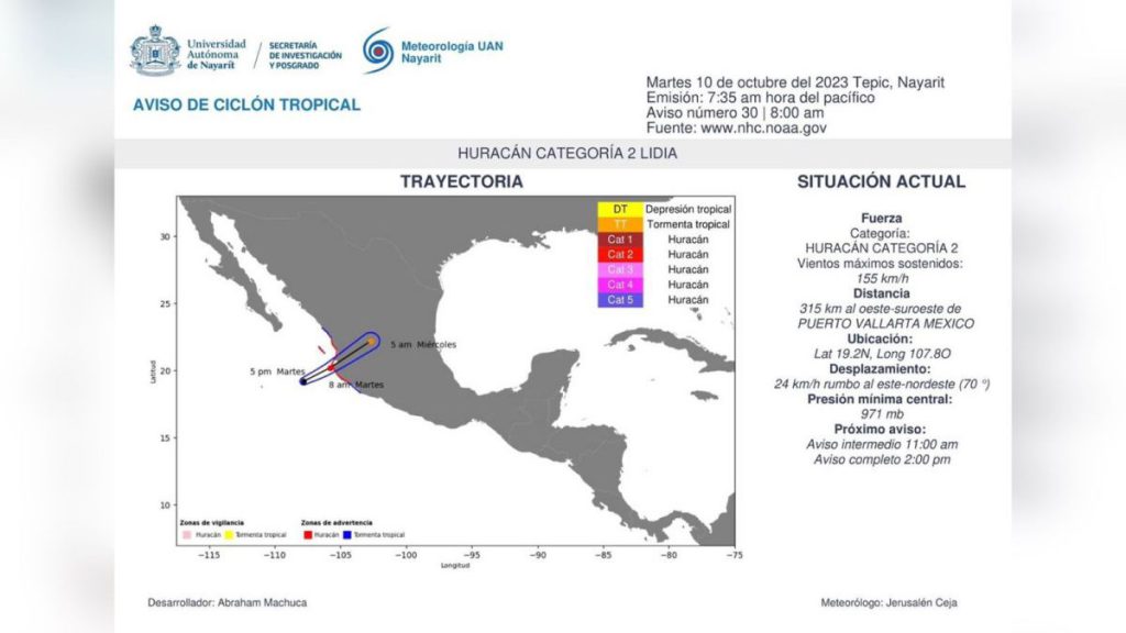 En una actualización temprana de esta mañana, la Secretaría de Investigación y Posgrado a través de Meteorología UAN Nayarit ha emitido el Aviso 30 sobre el huracán Lidia. En este reporte, se confirma que Lidia ha alcanzado la categoría 2 en la escala de huracanes Saffir-Simpson, con vientos máximos sostenidos de 155 km/h.