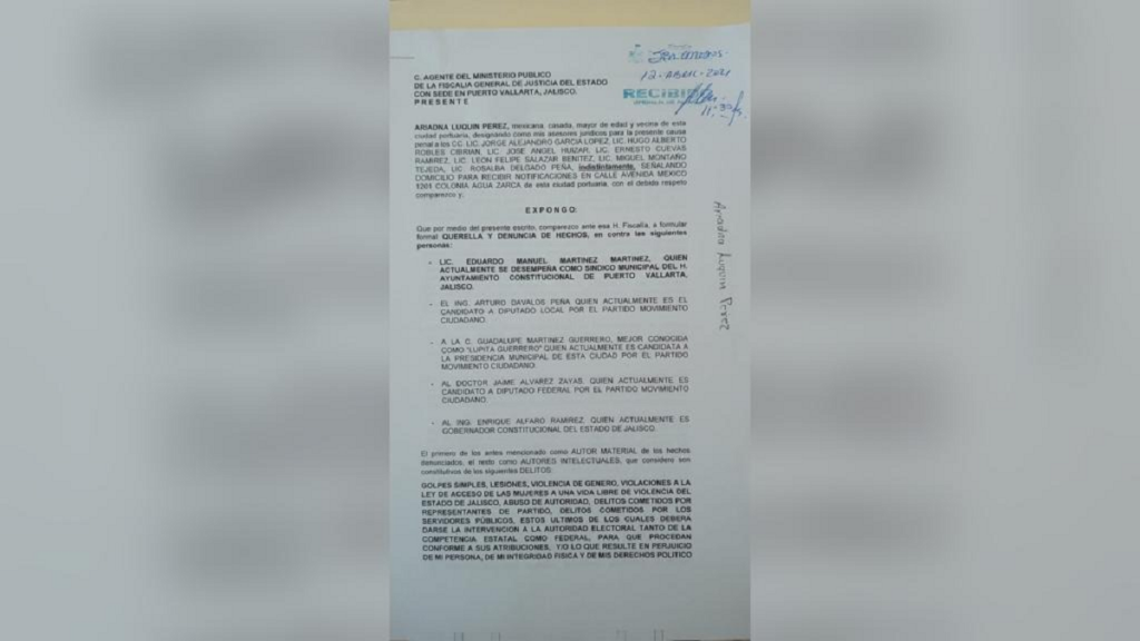 Este lunes, fue presentada ante la Fiscalía General de Justicia de Jalisco con sede en Vallarta una denuncia formal en contra del síndico del Ayuntamiento de Puerto Vallarta, Eduardo Martínez, señalado como autor material del ataque que sufrieton brigadistas del Partido Verde en la delegación Ixtapa.