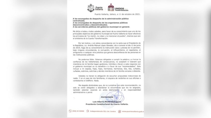 Lo anterior “incluye a mi esposa, hijas, hijos, hermanos, hermanas, tíos, tías, cuñados, cuñadas, sobrinos, sobrinas y demás miembros de mi familia cercana o distante”; pues, aseguró, no tolerará que miembros de su familia hagan gestiones, trámites o lleven a cabo negocios con el gobierno municipal en su beneficio o en favor de sus “recomendados”.