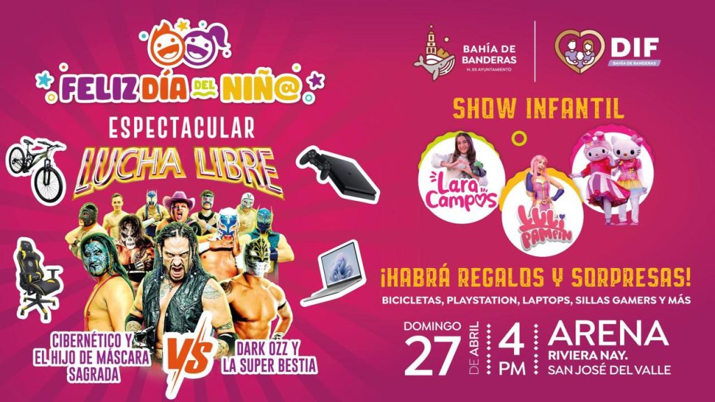 El gobierno municipal y el DIF celebrarán el Día del Niño este domingo 27 de abril en la Arena Riviera Nayarit, con un espectáculo familiar que incluirá show infantil, sorpresas y una función estelar de lucha libre.