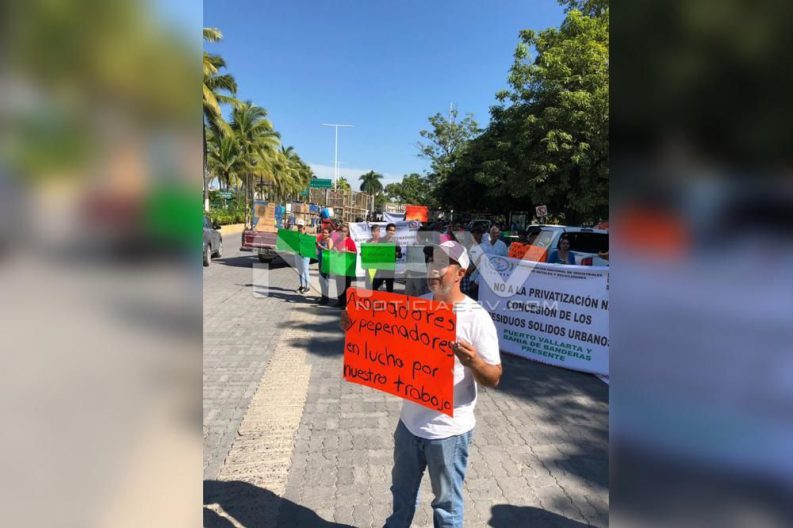 Cerca de 500 pepenadores protestaron esta mañana en Bahía de Banderas y Puerto Vallarta, como parte de un movimiento nacional, inconformes por la aplicación de la ley general para la prevención y gestión integral de los residuos, promovida por el Partido Verde Ecologista de México, PVEM, medida que afectará a 15 mil recicladores en la región.