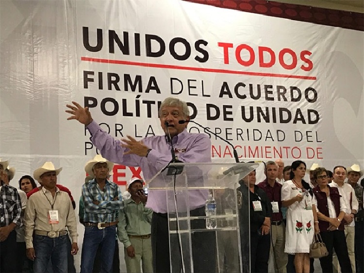 El tabasqueño llegó a Sonora para encabezar la firma del Acuerdo Político de Unidad por la Prosperidad del Pueblo y el Renacimiento de México, donde adelantó que el proyecto de nación 2018-2024 se resume en gobernar con rectitud, desterrar la corrupción, abolir la impunidad, actuar con austeridad y destinar los ahorros para financiar el desarrollo del país.