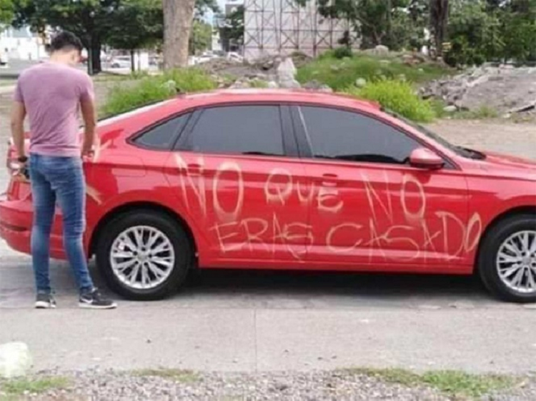 Através de redes sociales se difundió la imagen del supuesto precio que tuvo que pagar un sujeto por engañar a una mujer. Sí, “supuesto” debido a que en la nube sólo se subieron imágenes de un auto con la leyenda: “No que no eras casado” y la imagen de un cerdo en uno de los costados de un automóvil color rojo.