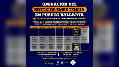 La operación del botón de emergencia en Puerto Vallarta aplica del 30 de octubre al 13 de noviembre del 2020, debido a que el 90% de la población de la actividad económica dependen del turismo y el 655 de la derrama económica se genera los fines de semana, su operación deberá ser diferenciada.