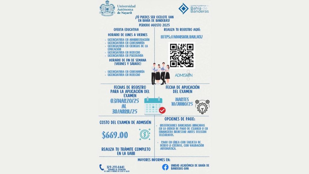 La Universidad Autónoma de Nayarit, en la Unidad Académica de Bahía de Banderas, te invita a integrarte a su comunidad estudiantil Ocelote UAN. Todavía estás a tiempo, pues la convocatoria para el proceso de admisión 2025 permanecerá abierta hasta el próximo 30 de abril.