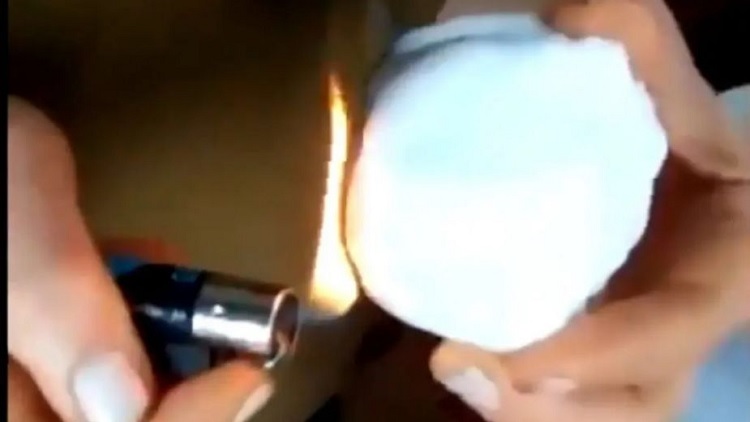 El hecho de que la bola no se deshaga inmediatamente, que una parte de ella se ponga negra y que la operación deje un olor «a plástico quemado» son para la mujer pruebas fehacientes de que la nieve no es nieve.