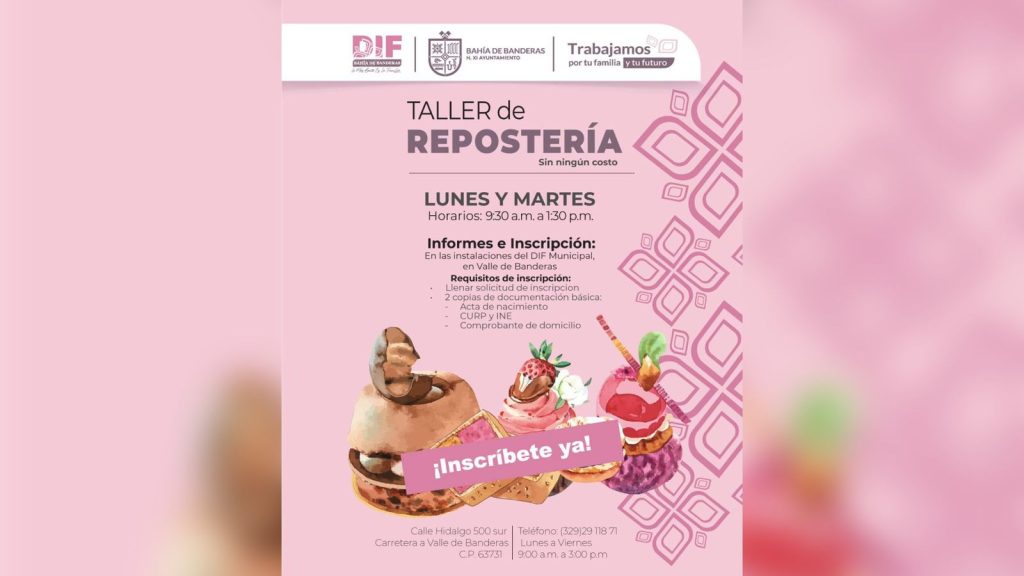 Bahía de Banderas Nay., 6 de agosto de 2024.- El Sistema Municipal DIF, invita a la población de Bahía de Banderas al Taller de Repostería, mismo que es completamente gratuito y será impartido los lunes y martes de 9:30 de la mañana a 1:30 de la tarde en las instalaciones del DIF de Bahía de Banderas, en Hidalgo 500 Sur, carretera a Valle de Banderas.