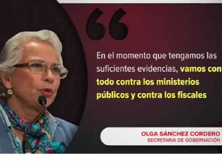La secretaria de Gobernación, Olga Sánchez Cordero, adelantó que irá con todo contra los fiscales y ministerios públicos corruptos. Esto lo dijo luego de asegurar que el sistema de justicia no está funcionando.
