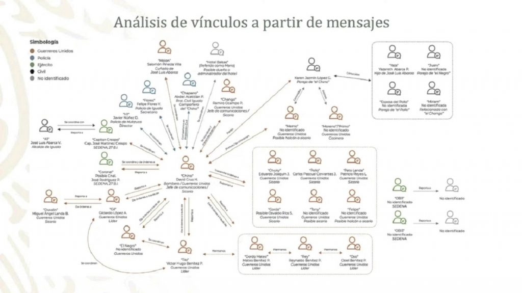 Al participar este viernes en la mañanera del presidente Andrés Manuel López Obrador, el subsecretario Encinas develó un diagrama que contiene los nombres y la red de vínculos que se dieron para la desaparición de los 43 estudiantes de la Normal. Esta información estaba testada en la copia del informe sobre el caso que el propio funcionario dio a conocer la semana pasada debido a que no se habían emitido las órdenes de aprehensión contra muchos de los presuntos involucrados, incluidos militares.