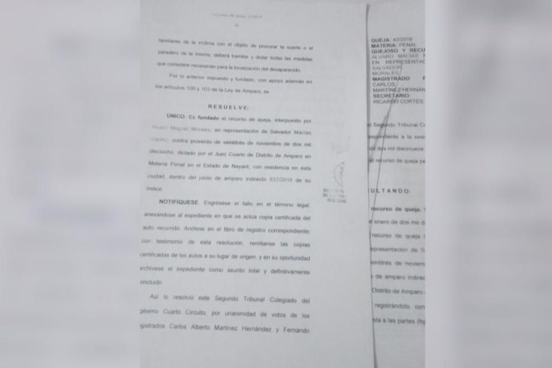 Dicho resolutivo lo dejó en estado de indefensión, fue emitido el pasado mes de noviembre 2018, en el cual se dio por sentado la suspensión del acto reclamado. El Juez de Distrito argumentó que, luego de que se realizaron las investigaciones pertinentes tanto por parte de la Fiscalía como de parte de esta jurisdicción federal para encontrar al agraviado y como éste no fue localizado se suspendía el procedimiento y advirtió que de no presentarse en este juicio en el transcurso de un año se tendría por no interpuesta la demanda de amparo, resolutivo que fue impugnado por Álvaro Macías Morales ante dicho Segundo Tribunal Colegiado con sede en Tepic, Nayarit, mediante una queja y tras demoras administrativas en este Tribunal, finalmente, ante otra nueva queja presentada ante este mismo Tribunal, a principio del mes de mayo 2019, este resulto a favor del padre de la víctima apenas el pasado 23 de mayo 2019.