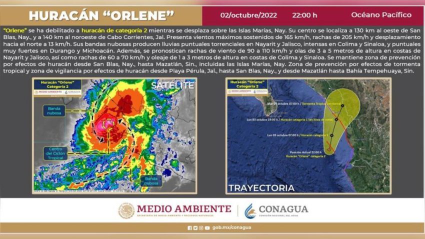Se pronostica que una corriente de vientos máximos en altura provoque que el huracán Orlene, de categoría 2, se debilite gradualmente; sin embargo, el sistema continuará desplazándose hacia la costa sur de Sinaloa y su centro podría impactar en las inmediaciones del sur de Sinaloa y el norte de Nayarit, durante la tarde y noche del lunes.