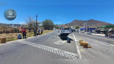 Las autoridades municipales del municipio de Compostela, dieron a conocer otro accidente más sobre la carretera federal 200, en el entronque hacia Chapalilla, también conocido como el crucero de Compostela, en donde se registró la volcadura de una camioneta, la cual iba cargaba con bidones con gasolina.