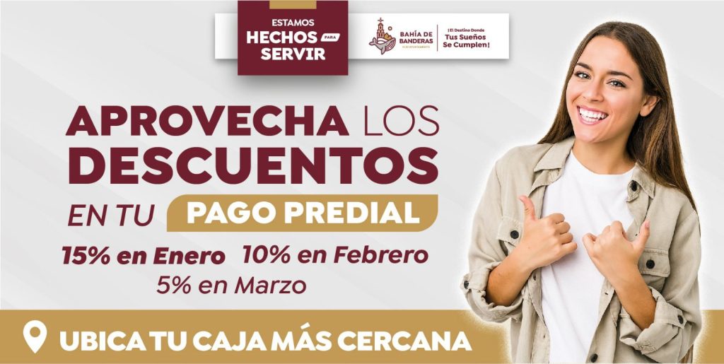 El Ayuntamiento de Bahía de Banderas, encabezado por Héctor Santana, facilita el pago del predial en línea o en módulos alternos. Aprovecha descuentos de hasta el 15% por pronto pago y contribuye al desarrollo del municipio.