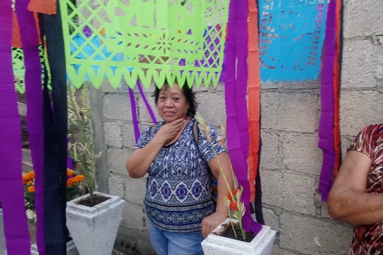Efectivamente, la tumba recién adornada se veía llena de colorido y es que con papel picado de diversos colores tradicionales para esta celebración lucían alrededor de las dos tumbas, donde también esta sepultada otro de sus familiares, pero también observamos ramos de flores de Cempaxúchitl, la flor tradicional también del Día de Muertos y una pequeña catrina, lo que le daba a la escena la idea de un altar de Muertos.