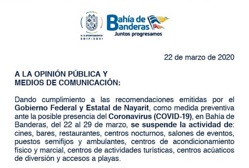 Dando cumplimiento a las recomendaciones emitidas por el Gobierno Federal y Estatal de Nayarit, como medida preventiva ante la posible presencia del Coronavirus (Covid-19), en Bahía de Banderas, del 22 al 29 de marzo, se suspende la actividad de: cines, bares, centros nocturnos, restaurantes, salones de eventos, puestos semifijos y ambulantes, centros de acondicionamientos y marcial, centros de actividades turísticas, centros acuáticos de diversión y accesos a playas.