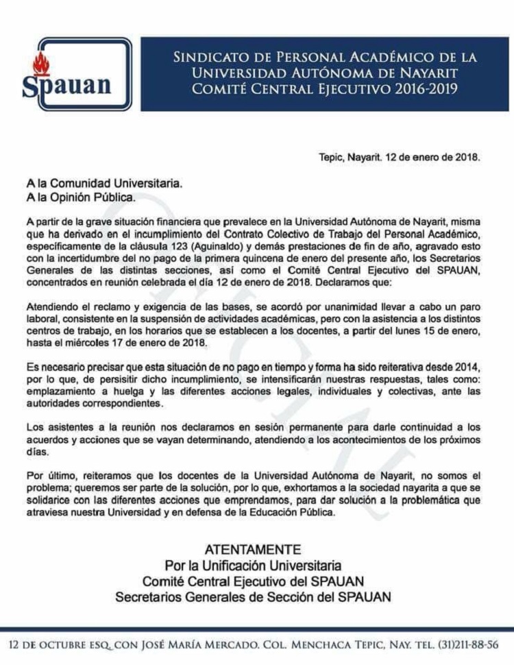 Luego de la reunión de trabajo celebrada el viernes 12 de enero 2018 por el Sindicato de Personal Académico de la UAN, los secretarios generales de las distintas secciones, así como el Comité Central Ejecutivo del SPAUAN, acordaron paro de laborales consistente en la suspensión de actividades académicas pero con asistencia a sus centros de trabajo a partir de este lunes 15 hasta el miércoles 17 de enero 2018, derivado de la falta de incumplimiento del Contrato Colectivo de Trabajo y el no pago del aguinaldo en tiempo y forma.