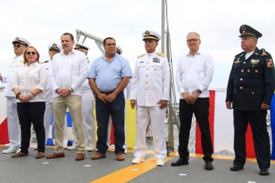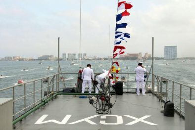 Posteriormente, las autoridades encabezadas por el Secretario General de Gobierno de Jalisco, a bordo del buque patrulla oceánica “Baranda”, llevaron a cabo la ceremonia de evocación a los marinos caídos en cumplimiento de su deber, lanzando una ofrenda floral al mar en su honor.