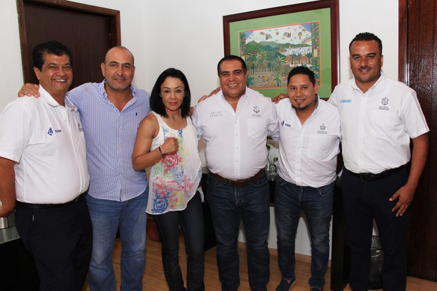 En esta visita, la ‘Princesa Azteca’ estuvo acompañada por Gustavo Fong Patiño, director del Deporte Municipal del CODE; el director del Consejo Municipal del Deporte (COMUDE), José Amador Hernández Madrigal, el esposo de la pugilista y representantes de la promotora.