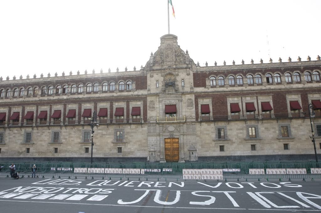 Con pintura blanca, los manifestantes escribieron en el suelo la frase “Ustedes quieren votos. Nosotros, justicia”, y colocaron las fotos de algunos de los periodistas asesinados en las vallas metálicas que resguardan Palacio Nacional, además de carteles con los nombres de todas las víctimas.