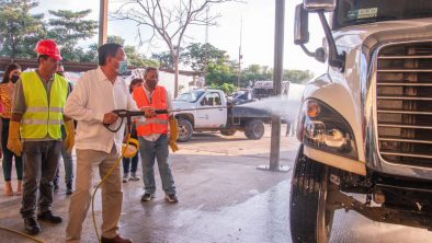 En su visita a la Estación de Transferencia, en la colonia Magisterio, el primer edil dio el banderazo para que los camiones rehabilitados se reintegren al servicio de recolección, muestran ya una nueva imagen, además de dotar de herramientas de trabajo básico a las cuadrillas, pues carecían de este material para sus labores.