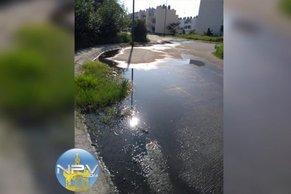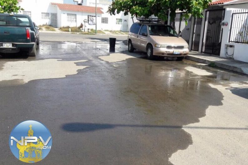 Y, por otra parte, por la calle Paseo Nuevo Vallarta junto a una tienda de abarrotes observamos la fuga de agua potable que desde un día antes se reventó la tubería.