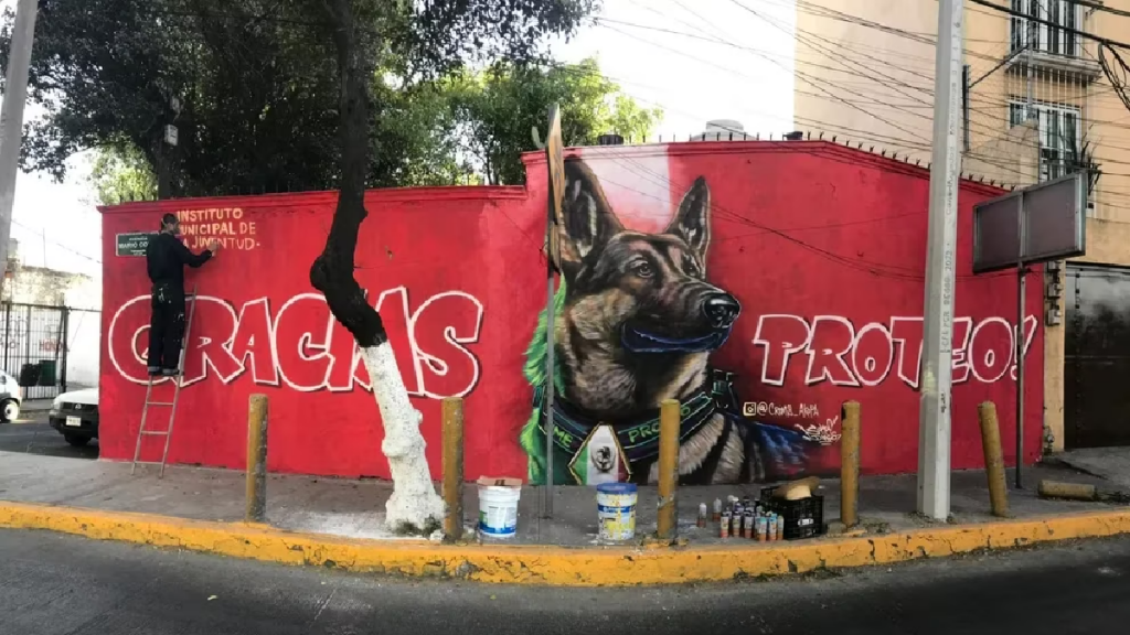 Miembros del Instituto Municipal de la Juventud (IMJ) del municipio de Tlalnepantla de Baz, pintaron un mural en honor a Proteo, perrito rescatista del escuadrón de ayuda humanitaria a Turquía de la Secretaría de la Defensa Nacional (Sedena).