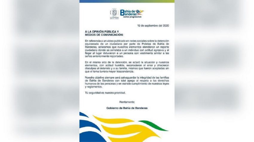 Aquí la publicación; “En referencia a un video publicado en redes sociales sobre la detención equivocada de un ciudadano por parte de policías de Bahía de Banderas, aclaramos que nuestros elementos atendieron un reporte ciudadano donde se señalaba a un individuo con actitud agresiva y al llegar al lugar detuvieron a una persona con vestimenta similar a las señas anteriormente reportadas.