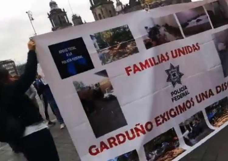 El agente es arropado por las familias de los agentes federales. Su malestar es porque sus esposos o padres fueron obligados a integrarse a la Guardia Nacional, enviados al Instituto Nacional de Migración, violando sus derechos humanos.