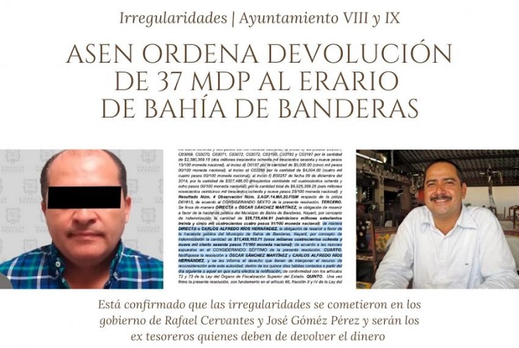 Es la resolución de la Auditoría Superior del Estado de Nayarit, luego de la investigación llevada a cabo en el manejo de los recursos públicos en el gobierno de Rafael Cervantes Padilla (qepd) del VIII Ayuntamiento y de José Gómez Pérez, en el IX Ayuntamiento de Bahía de Banderas. Los ex tesoreros de estos gobiernos, Oscar Sánchez y Carlos Alfredo Ríos Hernández, respectivamente, deberán de regresar a las arcas municipales la suma de 37 millones 224 mil 565.60 pesos.