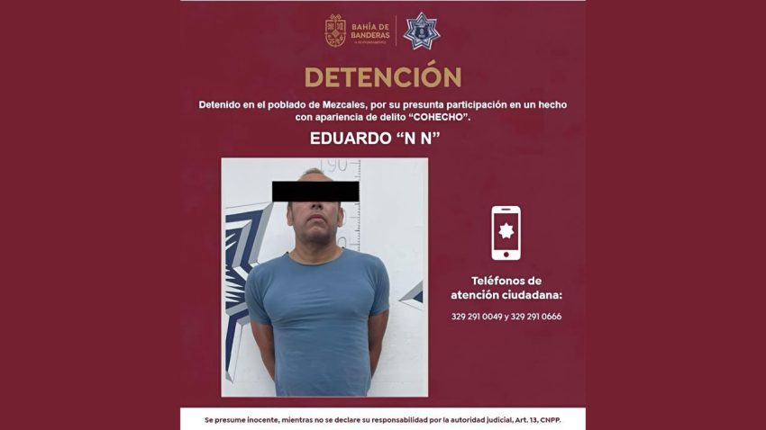 Elementos de la corporación de seguridad realizaron la detención de un hombre identificado como Eduardo “N”, por su presunta participación en el delito de cohecho, durante un operativo efectuado en el poblado de Mezcales, municipio de Bahía de Banderas.