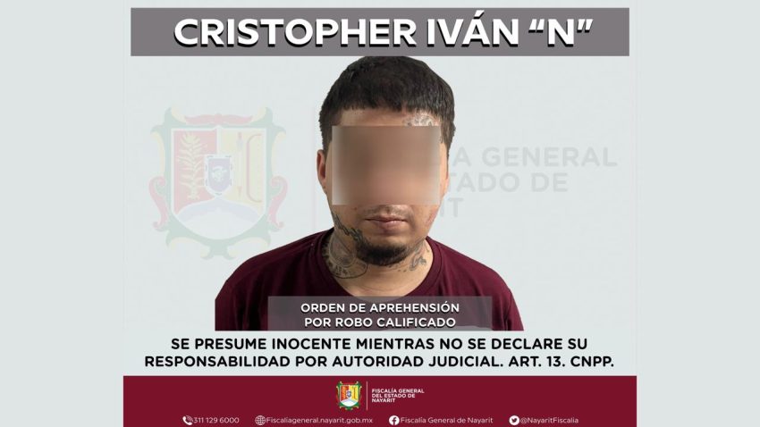 Comunicado.- La Fiscalía General de Nayarit a través de la Agencia de Investigación Criminal ejecutó una orden de aprehensión en el municipio de Bahía de Banderas contra Cristopher Iván “N”, por su presunta participación en hechos que según apreciación de la ley encuadran el delito de robo calificado, en detrimento de tres personas de sexo masculino cuyas identidades se mantienen bajo reserva.