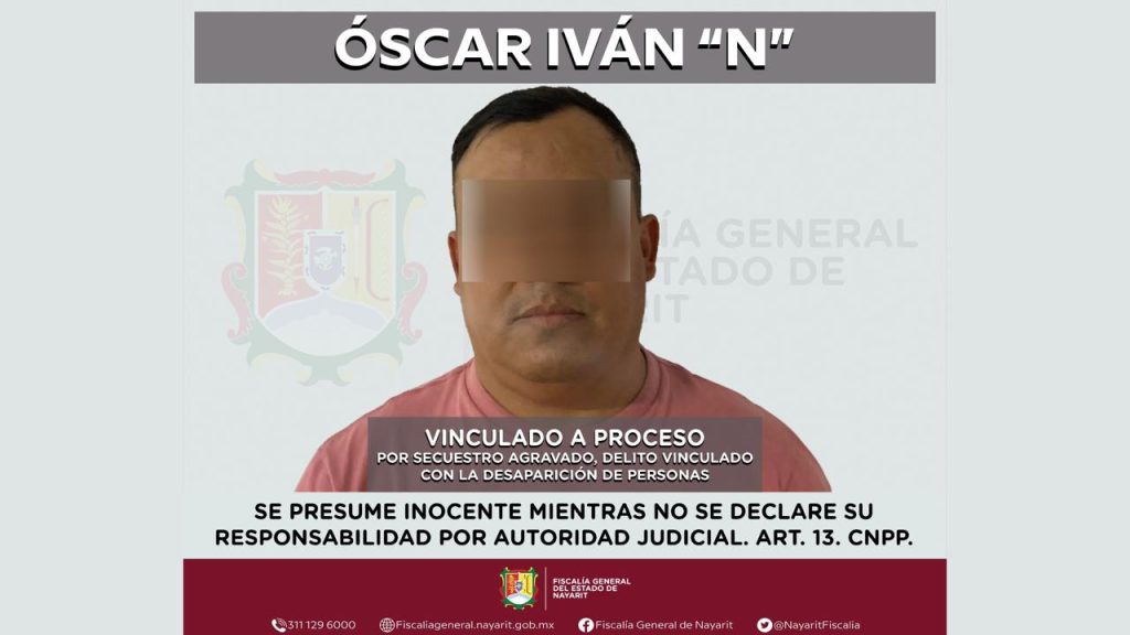 La Fiscalía General del Estado de Nayarit informó que Óscar Iván “N” fue vinculado a proceso por su probable responsabilidad en los delitos de secuestro agravado y delito relacionado con la desaparición de personas, en agravio de dos hombres cuyas identidades no han sido reveladas por motivos de confidencialidad.