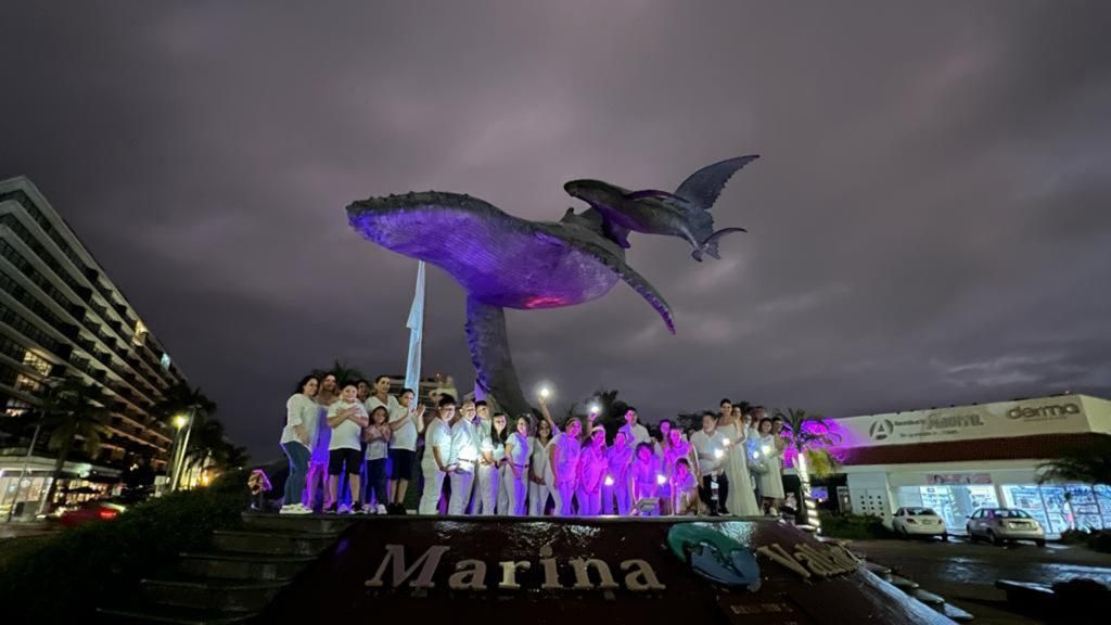 Realizan encendido de la iluminación de la escultura de la ballena de Marina Vallarta, en memoria de los bebés que han dejado un vacío en las familias que los esperaban