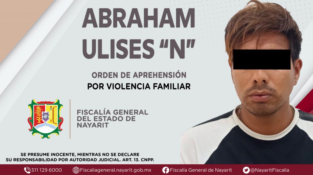 Comunicado.- La Fiscalía General de Nayarit a través de la Agencia de Investigación Criminal dio cumplimiento a una orden de aprehensión en el municipio de Bahía de Banderas contra Abraham Ulises “N”, por su presunta participación en hechos que según apreciación de la ley encuadran el delito de violencia familiar, en agravio de una mujer de identidad reservada.