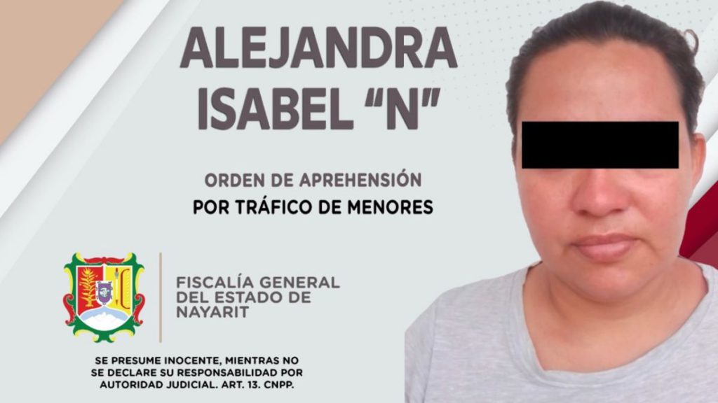 Comunicado.- La Fiscalía General de Nayarit a través de la Agencia de Investigación Criminal, dio cumplimiento a una orden de aprehensión contra Alejandra Isabel “N”, por su probable participación en hechos que para la ley constituyen el delito de tráfico de menores, cometido en agravio de un bebé de seis días de nacido.