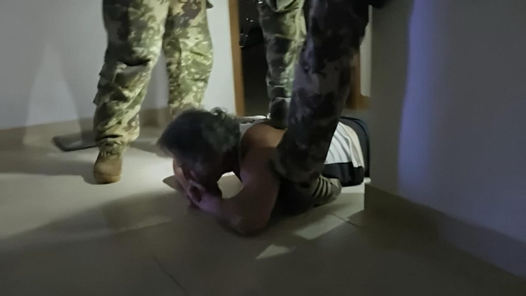También muestra a Hernán Bermúdez Requena en el piso, sometido por un policía que coloca su pie en la espalda del detenido.