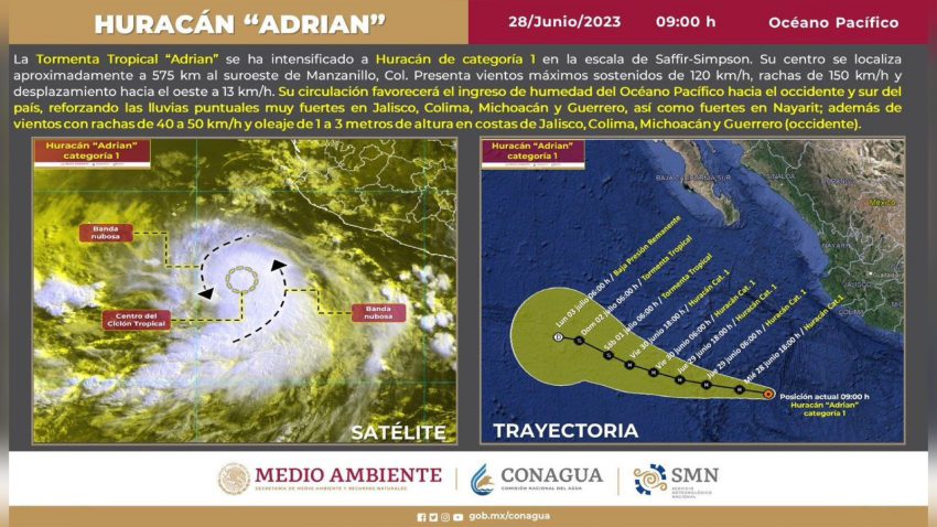La mañana de hoy, la tormenta tropical Adrian se ha fortalecido y ha alcanzado la categoría 1 en la escala Saffir-Simpson, convirtiéndose en el primer huracán de la temporada. A las 09:00 horas, tiempo del centro de México, el centro del huracán se encontraba a aproximadamente 575 kilómetros al suroeste de Manzanillo, Colima. Los vientos máximos sostenidos son de 120 kilómetros por hora, con ráfagas de hasta 150 kilómetros por hora y se desplaza hacia el oeste a 13 kilómetros por hora.