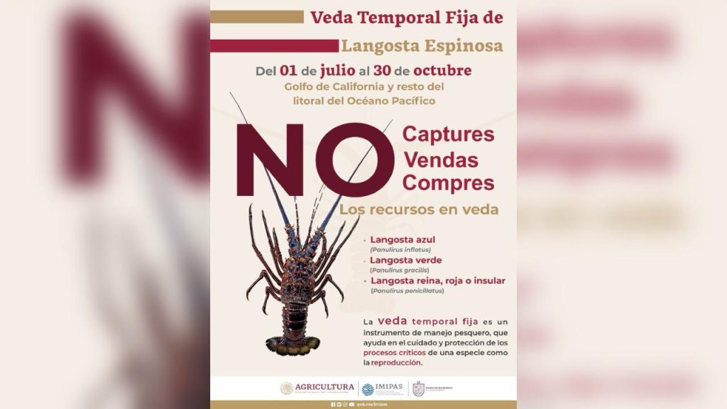 Bahía de Banderas Nay., 08 de julio de 2024.- La Secretaría de Agricultura y Desarrollo Rural, en conjunto con El Instituto Mexicano de Investigación en Pesca y Acuacultura Sustentables (IMIPAS) y con apoyo del gobierno municipal de Bahía de Banderas, informan a la población que del 01 de julio al 30 de octubre, queda prohibida la captura, venta y compra de langosta espinosa en el Golfo de California y el litoral del Océano Pacífico.