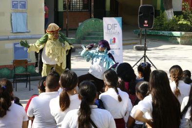 Durante la obra de teatro, se explicó la diferencia entre la sana alimentación con el consumo de frutas y verduras y la comida chatarra, con una dinámica de botargas y personajes en la que participaron algunos alumnos a través del juego para identificar “el plato del buen comer”, así como la activación física para evitar problemas de salud como la obesidad, colesterol diabetes, entre otras enfermedades.