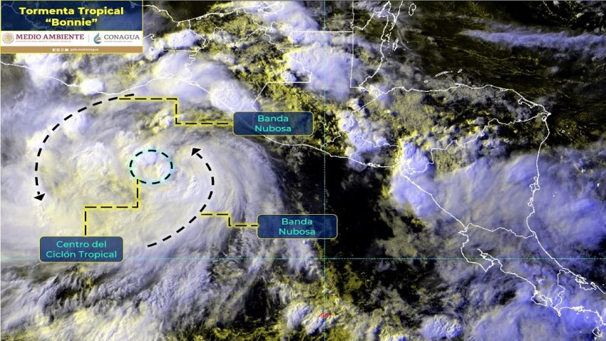 El ciclón tropical Bonnie se desplazará paralelo a las costas de Guerrero y Oaxaca, sus extensas bandas nubosas continuarán interactuando con un canal de baja presión sobre el oriente y sureste de México, condiciones que propiciarán lluvias intensas en Chiapas, Guerrero, Michoacán, Oaxaca y Veracruz; muy fuertes en Colima, Jalisco y Puebla, y fuertes en el Estado de México, Morelos, Nayarit y Tabasco.