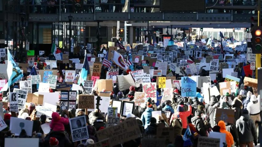 En Mineápolis, cerca de los lugares donde ocurrieron las tragedias, maestros marcharon con megáfonos advirtiendo que la «invasión agresiva» de agentes federales es una amenaza que podría extenderse a cualquier rincón del país si no se detiene ahora.