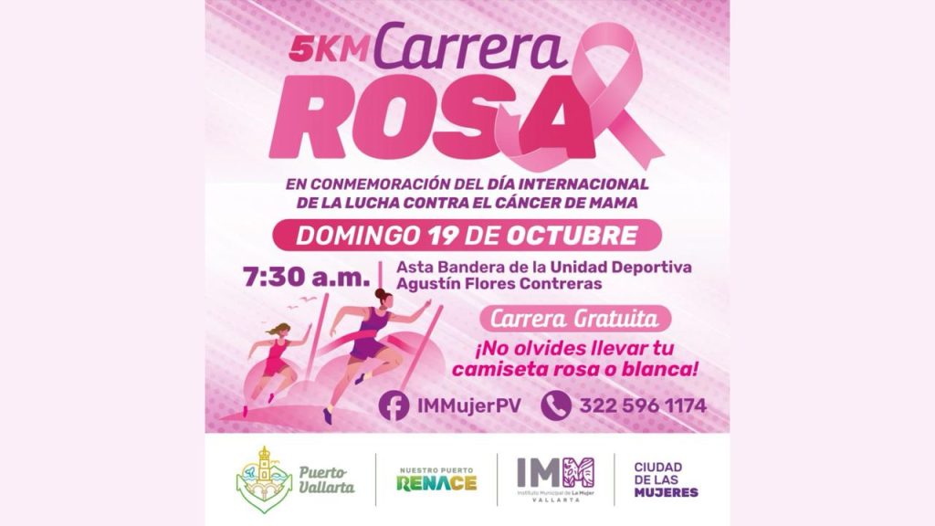 Puerto Vallarta se pone los tenis para correr con causa este domingo 19 de octubre en la Carrera Rosa 5K, impulsada por el gobierno de Luis Munguía a través del Instituto Municipal de la Mujer. La cita será en la Unidad Deportiva Agustín Flores Contreras, en el marco del Día Internacional de la Lucha contra el Cáncer de Mama, una jornada que busca unir a la sociedad en un mensaje de solidaridad y recordar que la prevención es la clave para salvar vidas.