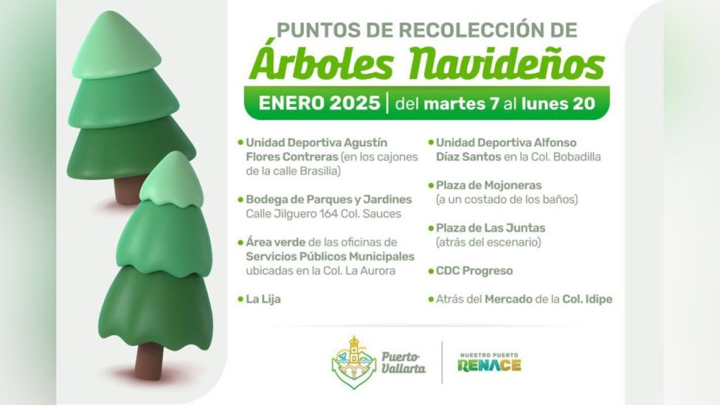 El gobierno de Puerto Vallarta habilitará 9 centros de acopio para pinos navideños del 7 al 20 de enero, con el objetivo de mantener limpias las calles y darles un destino adecuado a estos árboles.