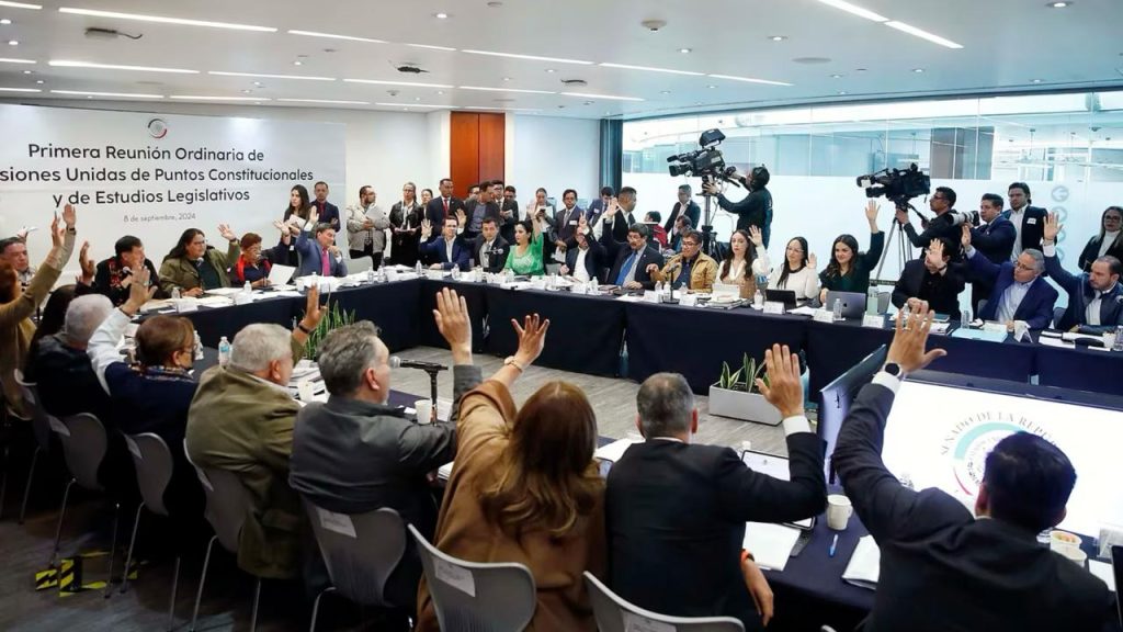 En la sesión del 8 de septiembre, el dictamen de la reforma al Poder Judicial fue aprobado en lo general y lo particular por las Comisiones Unidas de Puntos Constitucionales y Estudios Legislativos del Senado. Con el respaldo de 25 votos a favor de senadores de Morena, PT y PVEM, y 12 en contra de PAN, PRI y Movimiento Ciudadano, el proyecto fue turnado a la Mesa Directiva y se tiene previsto que se vote en los próximos días.