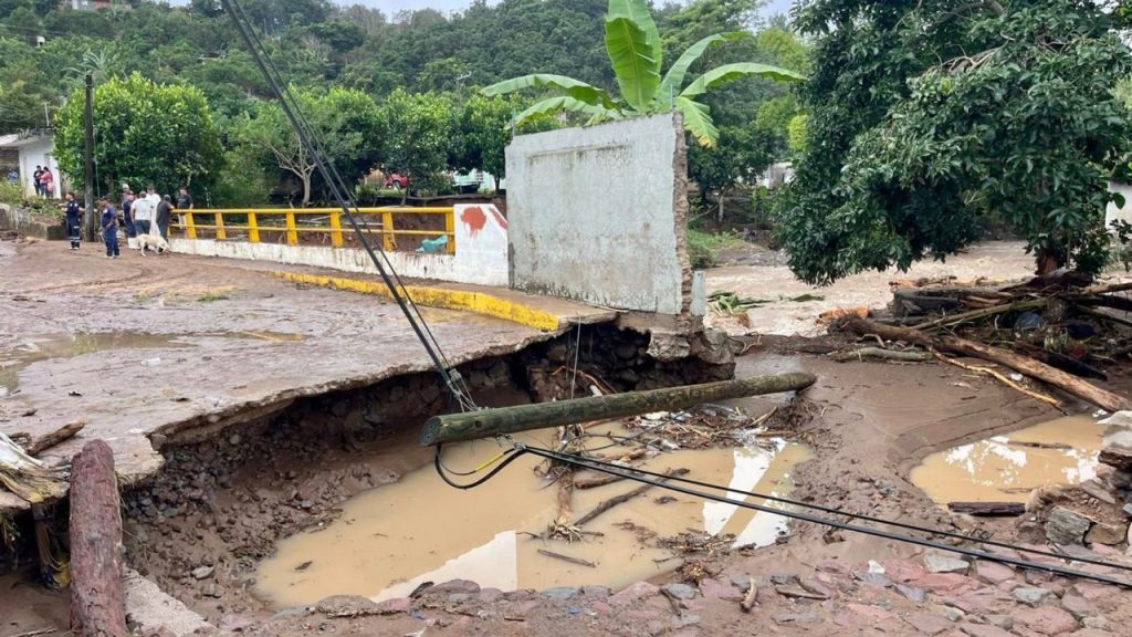 En la comunidad de Jalcocotán, perteneciente a San Blas, se registró el colapso de un puente ubicado en la calle San Luis, luego de que el arroyo que atraviesa la localidad se desbordara. El incidente también provocó el derrumbe de una vivienda, sin que hasta el momento se reporten pérdidas humanas.