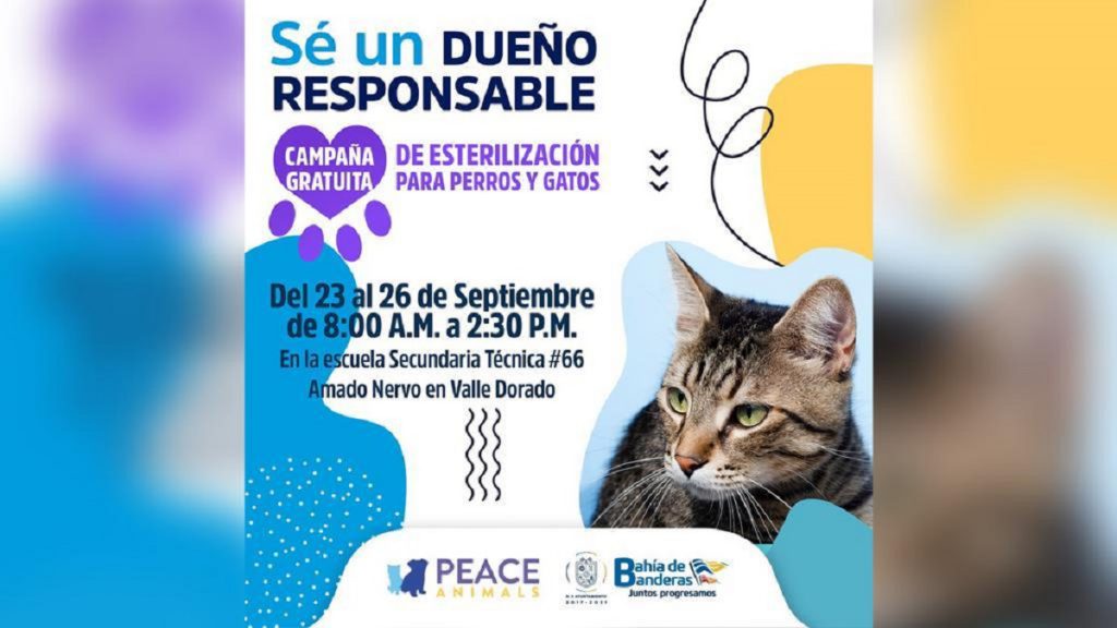 Como resultado de una serie de gestiones realizadas por el presidente municipal de Bahía de Banderas, doctor Jaime Cuevas Tello y con el objetivo de brindar una mejor calidad de vida a animales de compañía, así como disminuir la población de perros y gatos en situación de calle, el Gobierno Municipal en coordinación con Asociaciones Civiles, llevará a cabo la Primer Campaña de Esterilización de Perros y Gatos: «Ésta es la primera campaña de esterilización de animales domésticos impulsada por el Ayuntamiento; será del 23 al 26 de septiembre próximo en las instalaciones de la Secundaria No. 66 ‘Amado Nervo’ en Valle Dorado”, dio a conocer Cristian García Aquino, subdirector de Medio Ambiente.