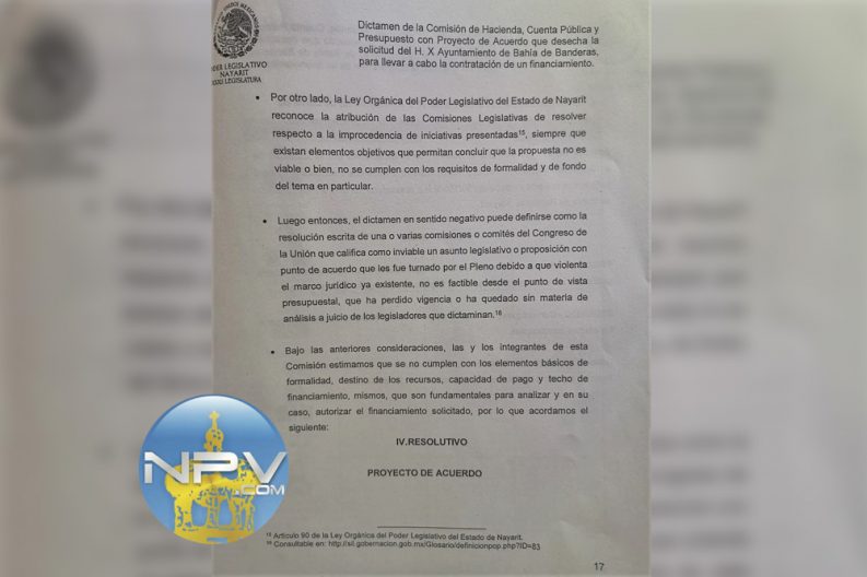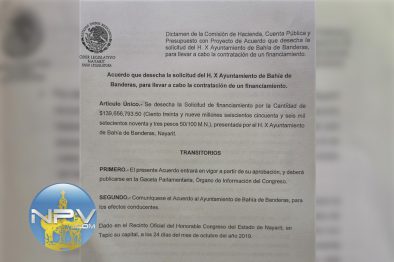 Este jueves 24 de octubre 2019 en punto de las 5 de la tarde se reunió la Comisión de Hacienda, Cuenta Pública y Presupuesto del Congreso Local de Nayarit en donde se analizaron propuestas de financiamientos (solicitudes para préstamos) de algunos municipios, entre ellos el de Bahía de Banderas, el cual fue desechado, rechazado en virtud de que, según el dictamen; no cumple con los elementos básicos de formalidad, destino de los recursos, capacidad de pago, y techo de financiamiento.