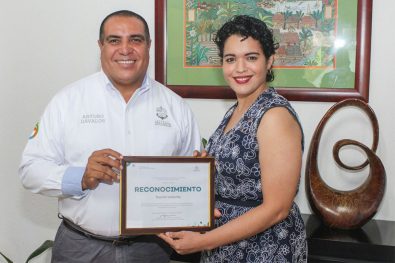 Claudia Barbosa recibió este reconocimiento a nombre del presidente municipal, Arturo Dávalos Peña, y esta a su vez lo hizo llegar de manera personal al primer edil vallartense.